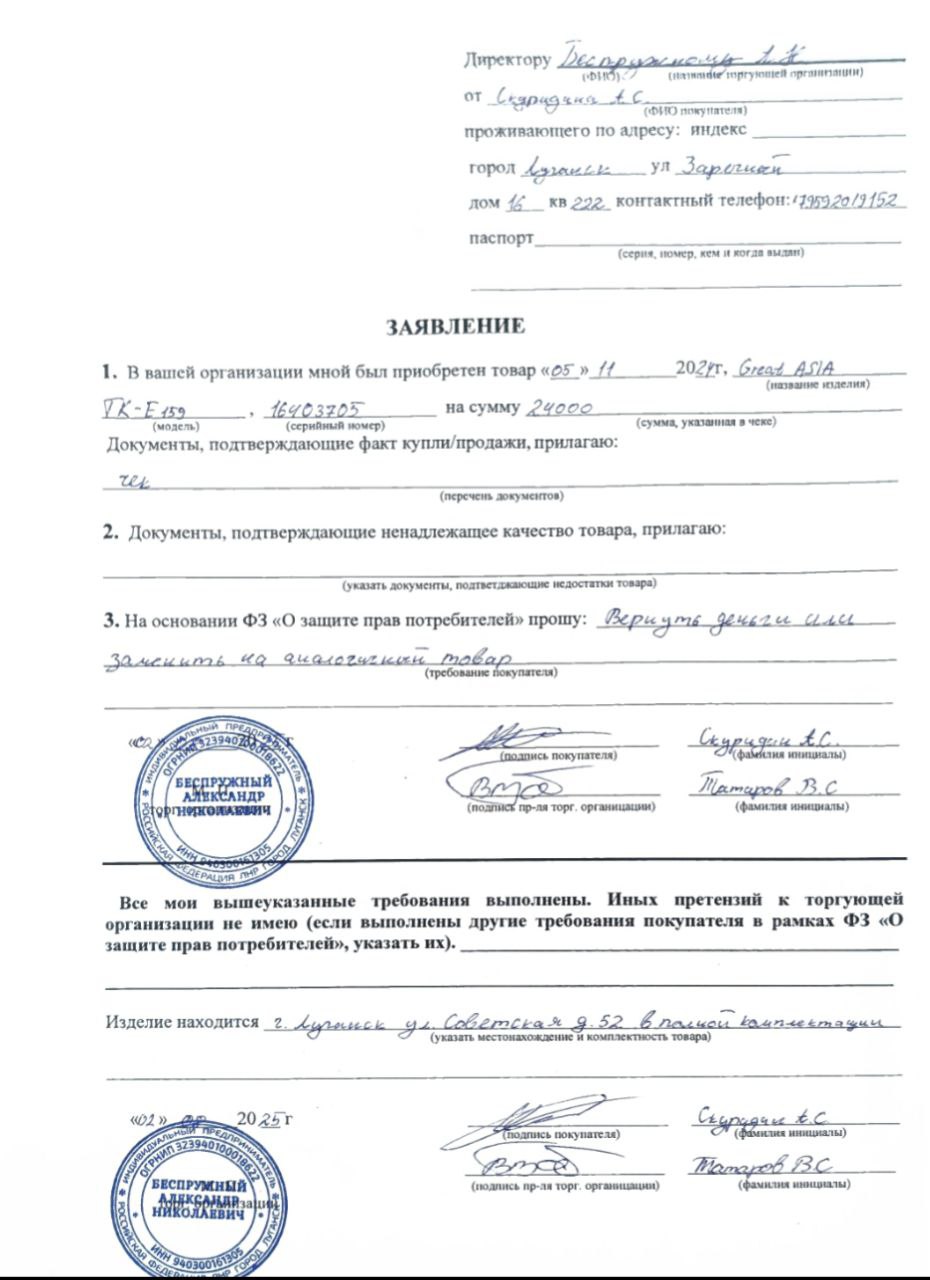 ../ Дополнительное_фото_1.jpg 03-Aug-2025 14:02 114K Дополнительное_фото_2.jpg 03-Aug-2025 14:02 160K Заявление о расчете с конечником.jpg 03-Aug-2025 14:02 117K Серийный номер (Стикер Техноуспеха).jpg 03-Aug-2025 14:02 248K Товар целиком.jpg 03-Aug-2025 14:02 114K Упаковка.jpg 03-Aug-2025 14:02 160K Чек.jpg 03-Aug-2025 14:02 218K