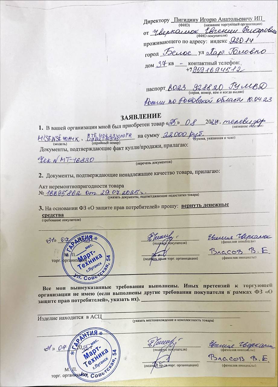 ../ Акт неремонтопригодности.jpg 04-Aug-2025 11:11 139K Гарантийный талон.jpg 04-Aug-2025 11:11 240K Дополнительное_фото_1.jpg 04-Aug-2025 11:11 100K Дополнительное_фото_2.jpg 04-Aug-2025 11:11 139K Заявление о расчете с конечником.jpg 04-Aug-2025 11:11 158K Товар целиком.jpg 04-Aug-2025 11:11 100K Упаковка.jpg 04-Aug-2025 11:11 100K Чек.jpg 04-Aug-2025 11:11 240K