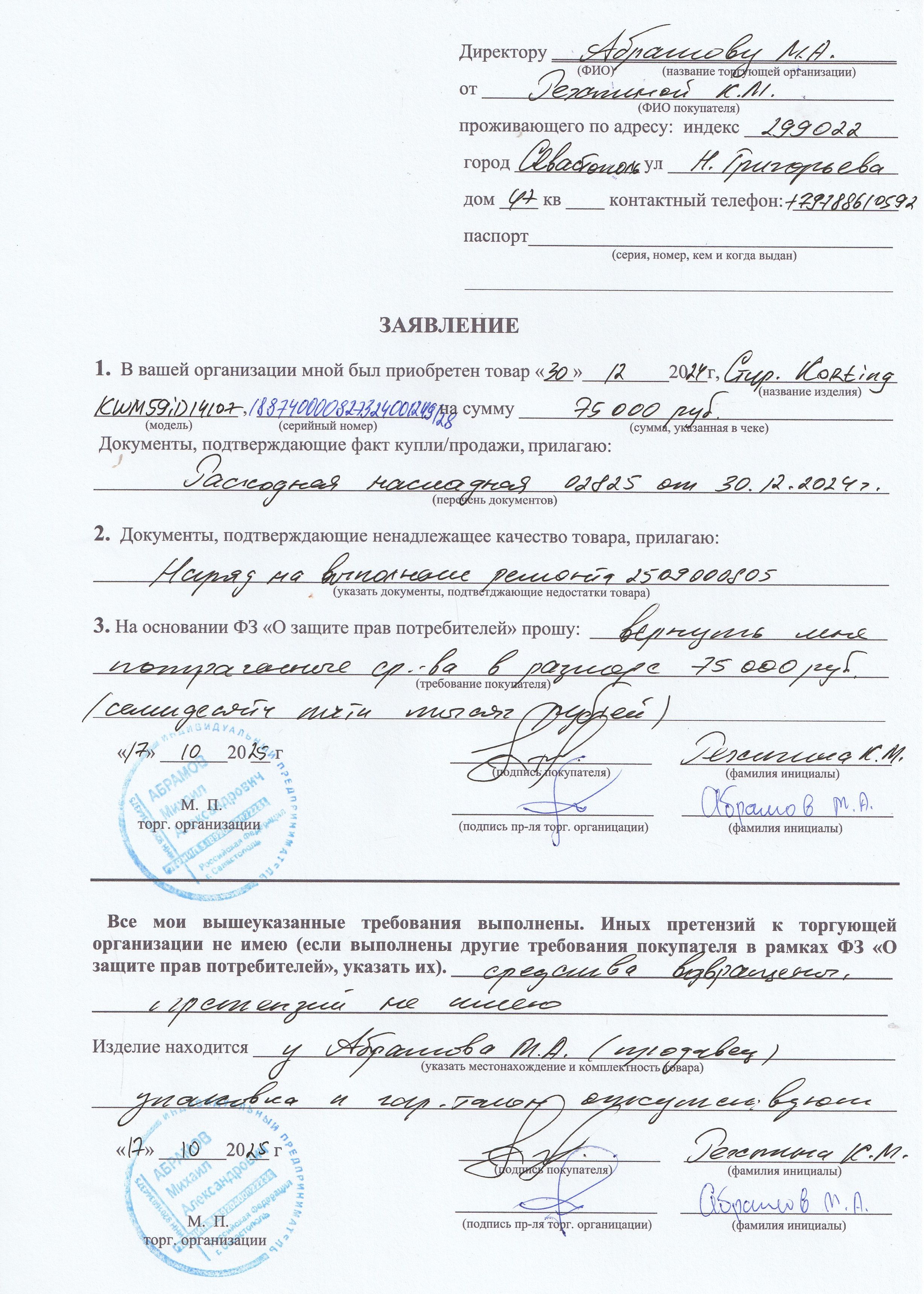 ../ Акт неремонтопригодности.jpg 09-Dec-2025 18:33 954K Дополнительное_фото_1.jpg 09-Dec-2025 18:33 119K Дополнительное_фото_2.jpg 09-Dec-2025 18:33 119K Заявление о расчете с конечником.jpg 09-Dec-2025 18:33 1M Заявление об утере гарталона.jpg 09-Dec-2025 18:33 897K Серийный номер (Стикер Техноуспеха).jpg 09-Dec-2025 18:33 81K Товар целиком.jpg 09-Dec-2025 18:33 119K Упаковка.jpg 09-Dec-2025 18:33 119K Чек.jpg 09-Dec-2025 18:33 1007K
