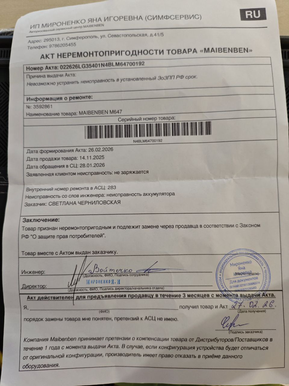 ../ Акт неремонтопригодности.jpg 03-Mar-2026 08:59 169K Гарантийный талон.jpg 03-Mar-2026 08:59 130K Дополнительное_фото_1.jpg 03-Mar-2026 08:59 206K Дополнительное_фото_2.jpg 03-Mar-2026 08:59 157K Заявление о расчете с конечником.jpg 03-Mar-2026 08:59 136K Серийный номер (Стикер Техноуспеха).jpg 03-Mar-2026 08:59 256K Товар целиком.jpg 03-Mar-2026 08:59 131K Упаковка.jpg 03-Mar-2026 08:59 185K Чек.jpg 03-Mar-2026 08:59 146K