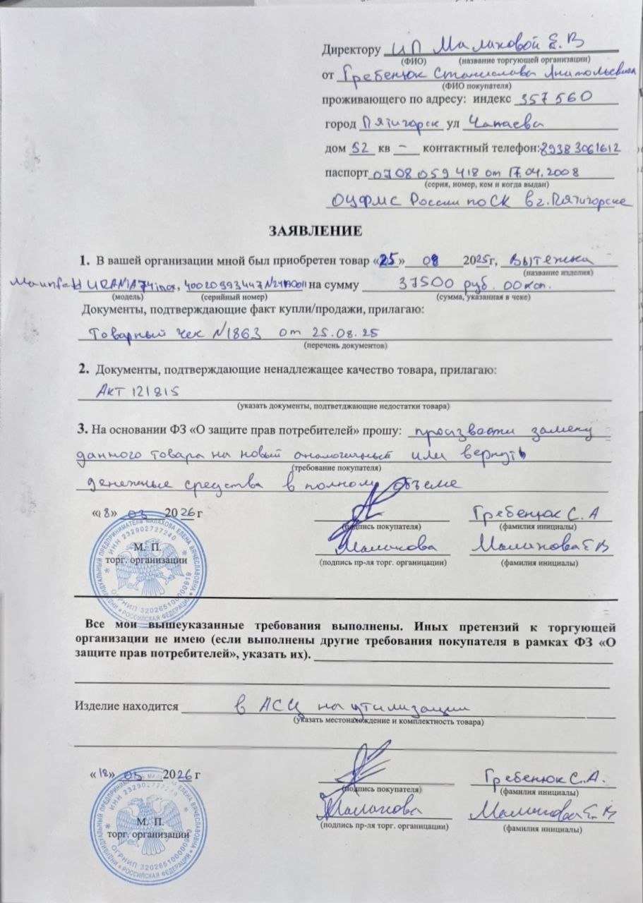 ../ Акт неремонтопригодности.jpg 24-Mar-2026 13:05 187K Дополнительное_фото_1.jpg 24-Mar-2026 13:05 185K Дополнительное_фото_2.jpg 24-Mar-2026 13:05 187K Заявление о расчете с конечником.jpg 24-Mar-2026 14:45 152K Серийный номер (Стикер Техноуспеха).jpg 24-Mar-2026 13:05 55K Товар целиком.jpg 24-Mar-2026 13:05 55K Упаковка.jpg 24-Mar-2026 13:05 55K Чек.jpg 24-Mar-2026 13:05 103K